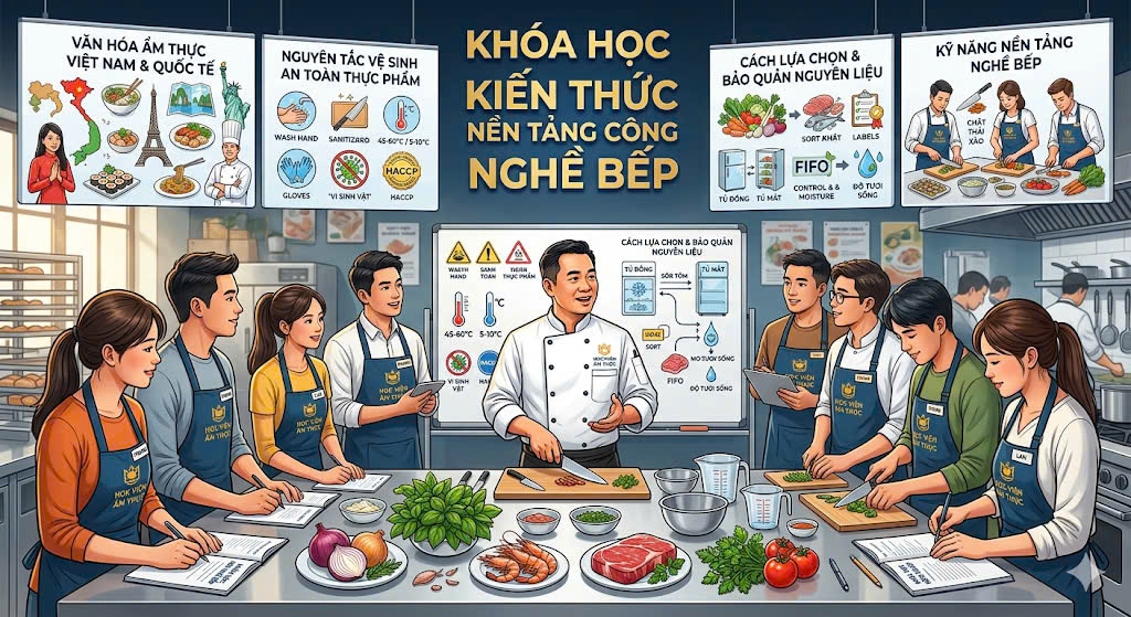 Khóa học giúp học viên nắm vững kỹ năng chế biến món ăn, vệ sinh an toàn thực phẩm, tổ chức bếp và trình bày món ăn. Học viên được thực hành các món ăn gia đình, món tiệc và đặc sản địa phương, đồng thời được hướng dẫn kỹ năng làm việc tại nhà hàng hoặc tự kinh doanh ẩm thực. Sau khóa học, học viên có đủ năng lực làm việc trong bếp chuyên nghiệp hoặc mở mô hình kinh doanh ăn uống.